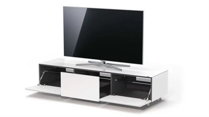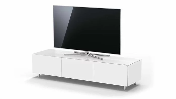 JUST by Spectral Lowboard in Breite 165cm mit Klappen links und rechts und einer Schublade mittig. Deckplatte und Aussenseiten aus kratzfestem Glas. Mit Kabelöffnung in der Deckplatte und hochwertigen Füssen aus Aluminium.