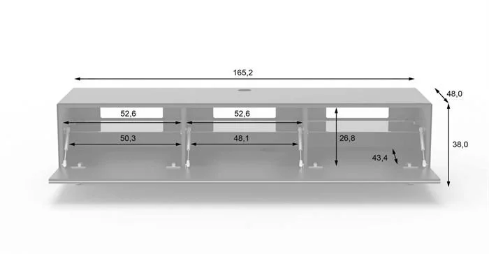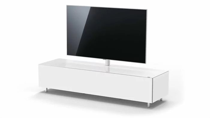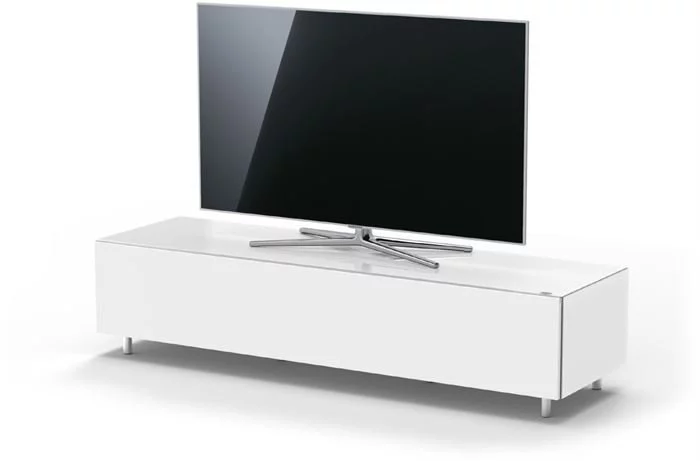 JUST by Spectral Lowboard in Breite 165cm mit Klappe. Deckplatte und Aussenseiten aus kratzfestem Glas. Mit Kabelöffnung in der Deckplatte und hochwertigen Füssen aus Aluminium.