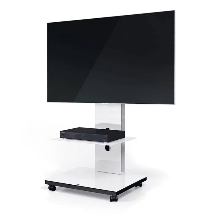 Spectral TV-Stand Tray mit satiniert lackierter Glasoberfläche. Inklusive zusätzlicher Glasablage, Kabelöffnungen und Rollen.