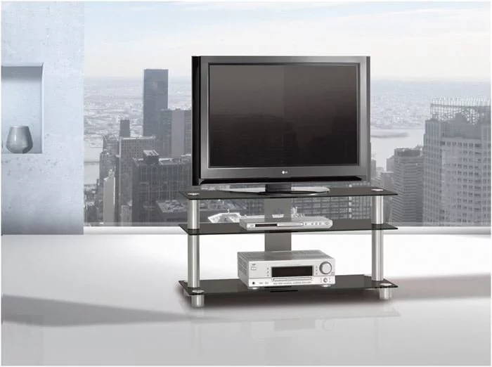 Die zwei Standsäulen sind aus einem robusten gebürsteten Aluminium gefertigt. Die drei Glasböden bestehen aus Schwarzglas und die Ränder haben einen glatten Schliff. Auf der Rückseite befindet sich ein elegantes Designelement aus Aluminium. Sie können diverse Kabel unauffällig auf der Rückseite entlangführen.
