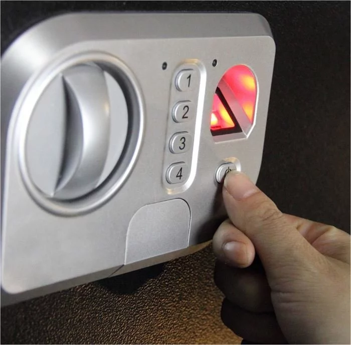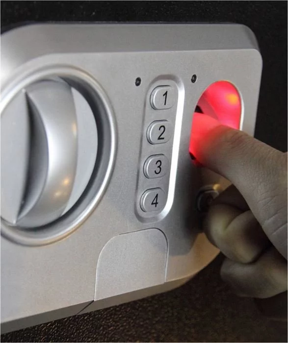 Um den Schließmechanismus des Tresores zu öffnen reicht es völlig aus, seinen Daumen auf den Fingerprintsensor zu legen. Sie können bei der Erstinbetriebnahme bis zu 20 Fingerabdrücke speichern. Unabhängig davon, kann der Tresor auch mit einem 4-8 stelligen Code geöffnet werden, den Sie beliebig vergeben können. Die Türe selbst wird anschließend mit einem Drehknopf geöffnet. Der Drehknopf ist mit einer Magnetspule verbunden, die die Drehung sehr vereinfacht. Zwei Farb-LEDs machen Sie immer darauf aufmerksam, ob der Tresor geöffnet oder geschlossen ist.