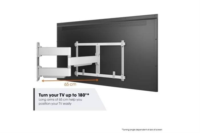 Bequemes Fernsehen aus jedem Winkel Die ELITE Full-Motion+ TV-Wandhalterung hat extra lange Tragarme mit einer Länge von 65 cm. So können Sie Ihren Fernseher je nach Bildschirmgröße um bis zu 90° nach links und rechts drehen, um sich aus jeder Ecke des Raumes am Fernseher erfreuen zu können. Dank OneFinger™ Movement können Sie Ihren Fernseher mit nur einem Finger in den gewünschten Blickwinkel bringen. Da dünne, fragile Bildschirme am besten nicht geneigt werden sollten, wurde auf die Neigefunktion verzichtet.